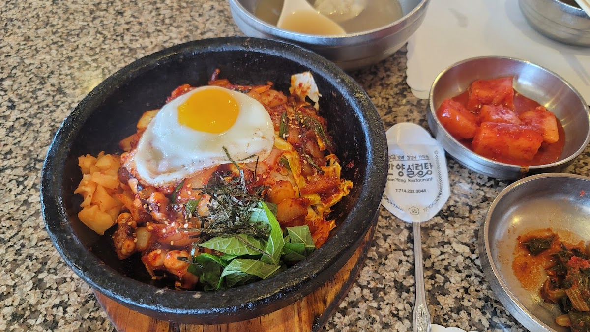 Han Yang is my favorite place for galbitang! Service/Ambiance: Their service is decent. Usually not the best for anyone that's not Korean but still okay. The inside is very cozy and the airoma of the soup is adds to this. Food Consensus: spicy sautéed small octopus bibimbap / naomi dol-sot : 9/10 I like how spicy and the saucy the dish is. The octopus is the perfect texture and the runny egg over all of it is amazing. I love this with white rice. korean bbq beef bibimbap / bulgogi dol-sot : 8/10 This is a solid beef bibimbap. It has everything a good bibimbap needs. I think it's good for sharing but I wouldn't eat it alone. beef short ribs soup / galbitang : 10/10 The galbitang is what I come for! The broth is beefy yet light and it's the perfect comfort meal. I love dipping the meat in that sauce they give you and having a spoonful of soup and rice. It's the best. The kimchi and other banchan dishes are very fresh and delicious. All the food I've tried so far is good. Definitely check it out when you're in Buena Park.